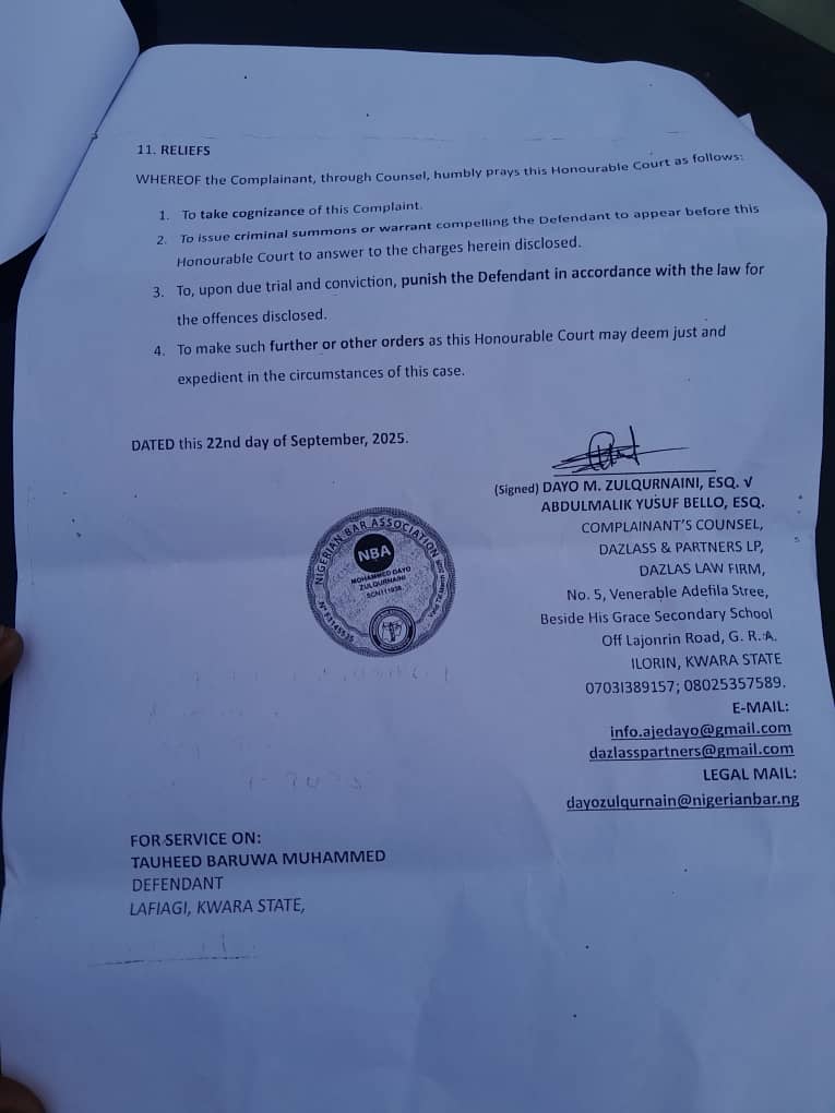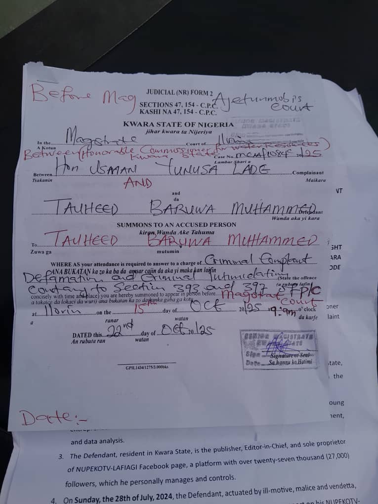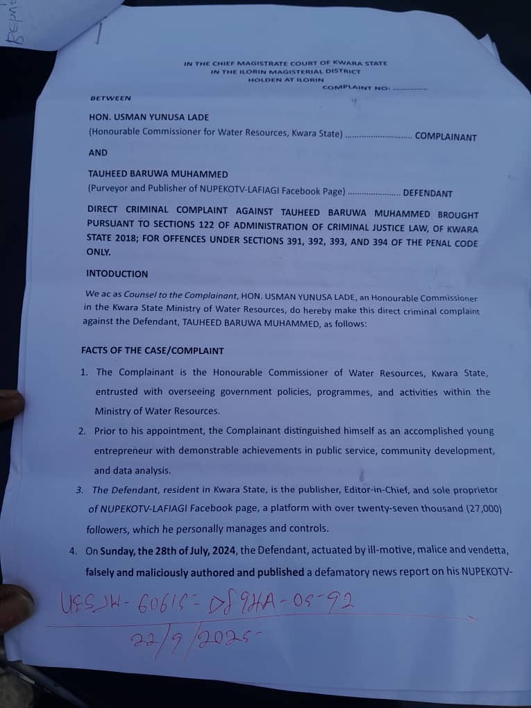The legal standoff between the Kwara State Commissioner for Water Resources, Hon. Usman Lade, and the founder of Nupekotv, Tauheed Baruwa Muhammed, has taken a dramatic turn as the Commissioner files fresh criminal charges against the media entrepreneur — even as a separate ₦10 million defamation suit remains pending in court.