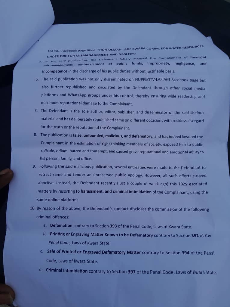 The case stems from a July 28, 2024 report published by NupekotvLafiagi, titled “Hon Usman Lade, Kwara Commissioner for Water Resources Under Fire for Mismanagement and Neglect.” The publication accused Lade of neglecting his core duties by failing to address acute water shortages in Lafiagi and nearby communities while allegedly mismanaging resources.
